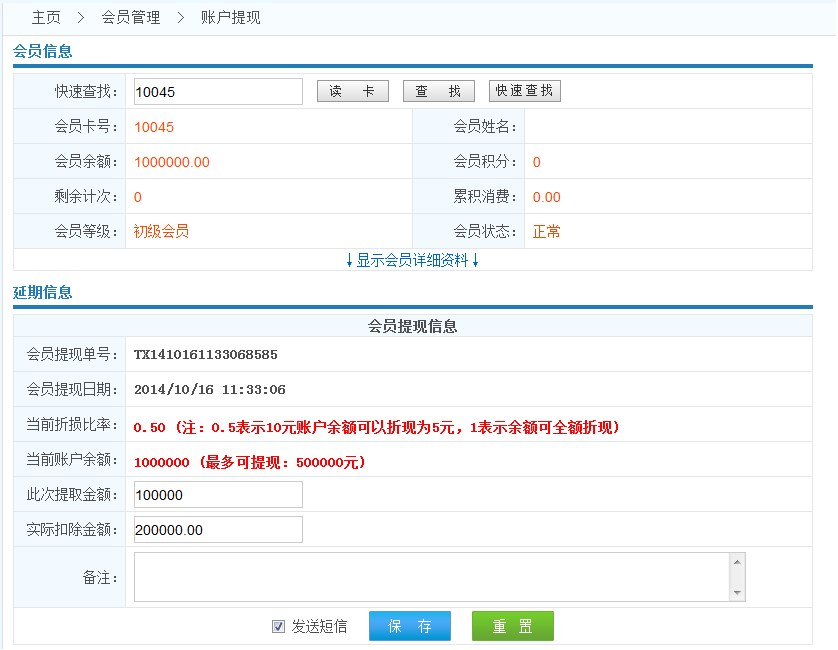 操作流程: 查找會(huì)員------>錄入提現(xiàn)金額------>保存------>密碼重置成功