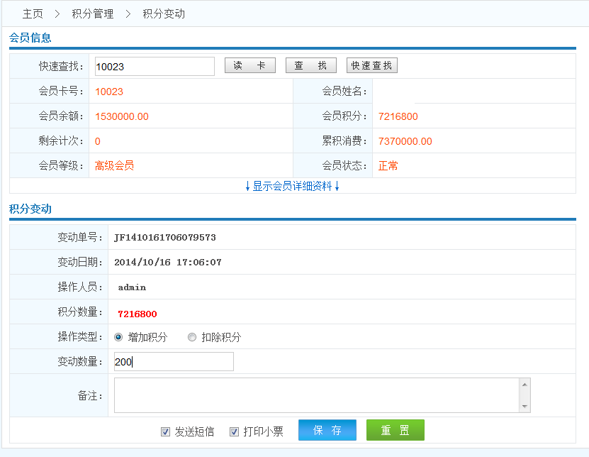 操作流程: 選中會員------>選擇異動類型------>填寫異動數(shù)量------>提交保存