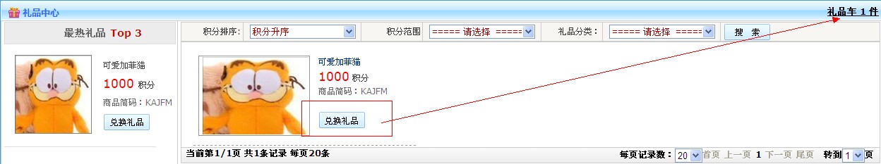 點擊兌換禮品添加到購物車內 點擊購物車1件 跳轉到兌換信息禮品頁面,填寫會員的地址會員備注信息提交兌換禮品申請!