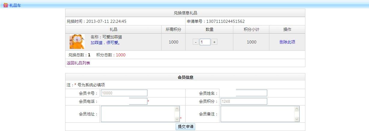 流程: 查詢禮品----->點擊兌換(加入購物車)----->審核購物車(提交申請)----->等待審核