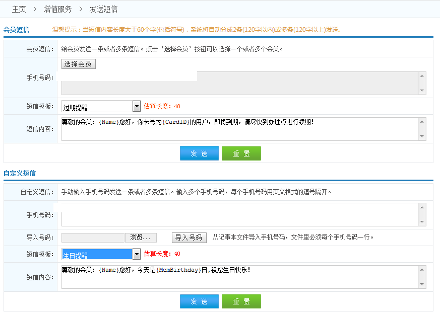 發(fā)送短信:給會員發(fā)送祝福、通知短信等等.     注意:當(dāng)短信內(nèi)容長度大于65字符,系統(tǒng)將會自動分成2條或者多條短信發(fā)送...